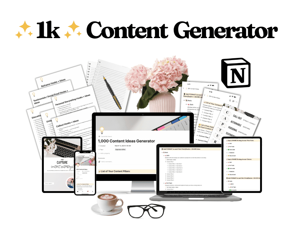 Never run out of content ideas again! The 1k Content Generator walks you through a step-by-step activity that generates 1,000+ ideas and customizes them to your brand, niche & audience (so they're specific to you)!