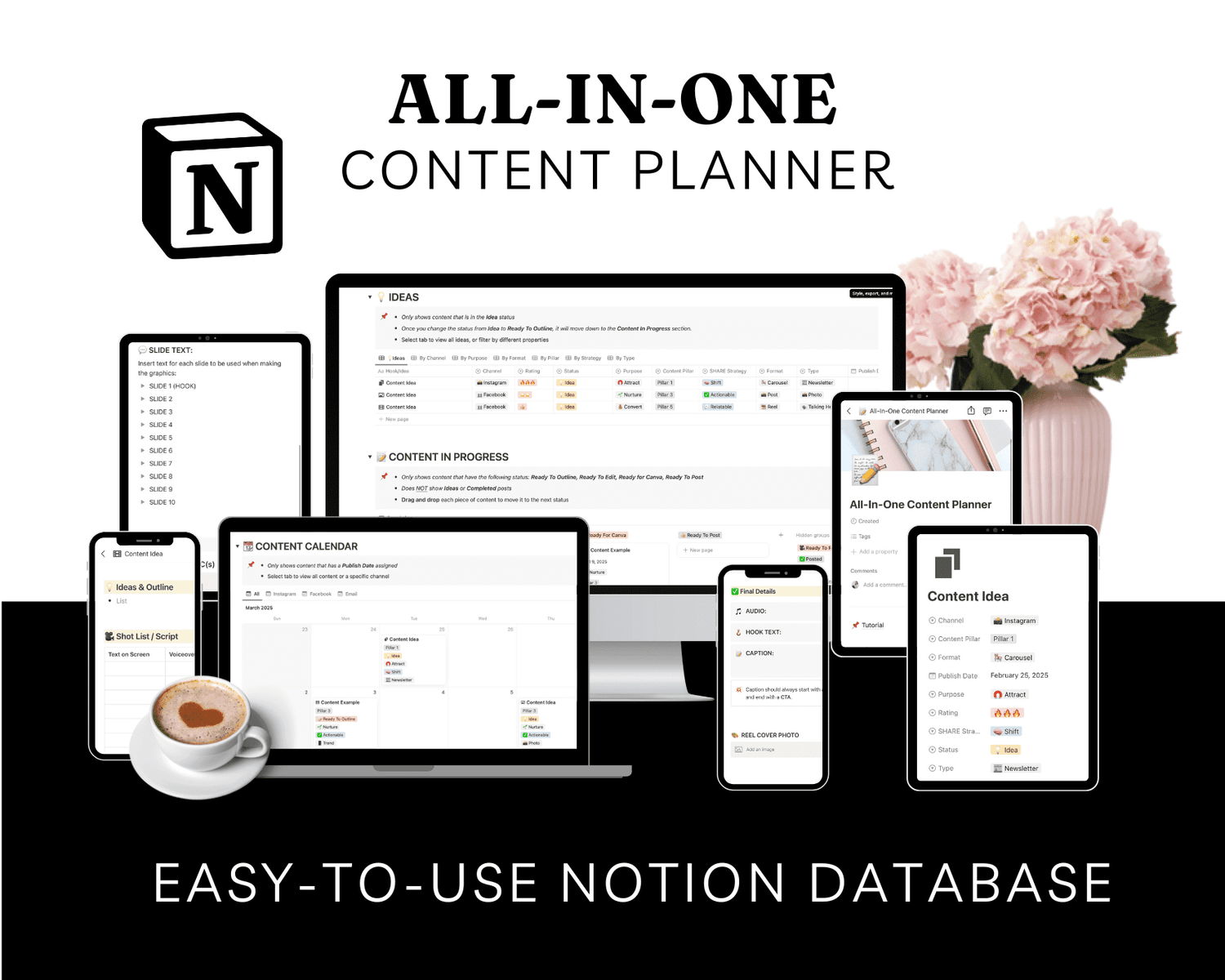 Say goodbye to content chaos! This Notion Content Planner was made for creators, entrepreneurs, and small business owners. Organize your ideas, plan ahead, and streamline your entire content workflow, all in one place.