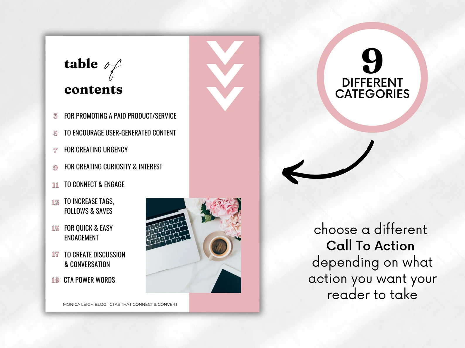9 different category types - so you have CTA examples to use for social posts, emails, your website & more!